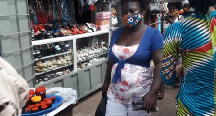 The Agona-Nkwanta market, one of the largest markets in the Western region, has been inundated with the wearing of nose masks of different types and colours. Traders and buyers alike, are all seen wearing a nose mask. Security men, stationed outside the market, do not allow anybody without nose mask entry to the market.