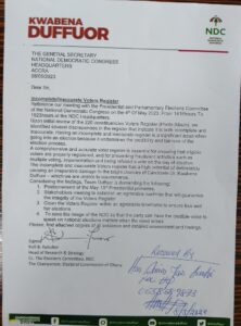 Dr. Duffuor’s campaign team states in a letter to the NDC General Secretary that the call is based on an incomplete and erroneous delegates registry that will be utilised for the elections.