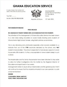 According to the GES, the school has enough capacity to accommodate an additional 300 students, but only 1467 of the 1790 vacancies declared by the school have been filled.