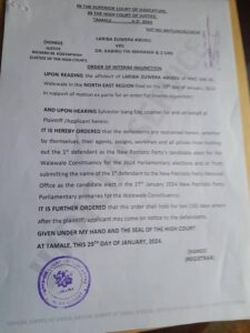 “It is hereby ordered that the defendants are restrained herein, whether by themselves, their agents, assigns, workmen, and allies, from holding out the 1st defendants as the New Patriotic Party’s candidate elect for the Walewale constituency for the 2024 parliamentary elections and or from submitting the name of the 1st defendants to the NPP, National office as the candidate elect in the 27th January 2024 New Patriotic Party parliamentary primaries for the Walewale constituency.