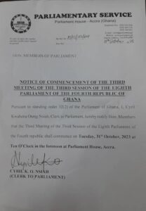 “Pursuant to standing order 32(2) of the Parliament of Ghana, I, Alban Sumana Kingsford Bagbin, Speaker of Parliament, hereby notify Honourable Members of the Third Meeting of the Third Session of the Eighth Parliament of the Fourth Republic which shall commence on Tuesday, 31 October at Ten O’clock in the forenoon at Parliament House, Accra.”