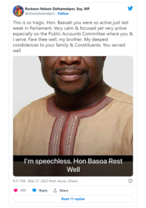 Mr. Dafeamekpor expressed shock at the legislator’s death in a tweet, adding he was highly engaged in parliament the previous week.