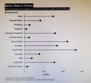 Banks operating in West Africa’s second-largest economy have taken a hit of about $1.4 billion, according to Bloomberg calculations, as Ghana restructures most of its public debt, estimated at 576 billion cedis.
