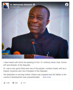 Vice President, Dr. Mahamudu Bawumia has paid homage to former Old Tafo Member of Parliament, Dr. Anthony Akoto Osei.