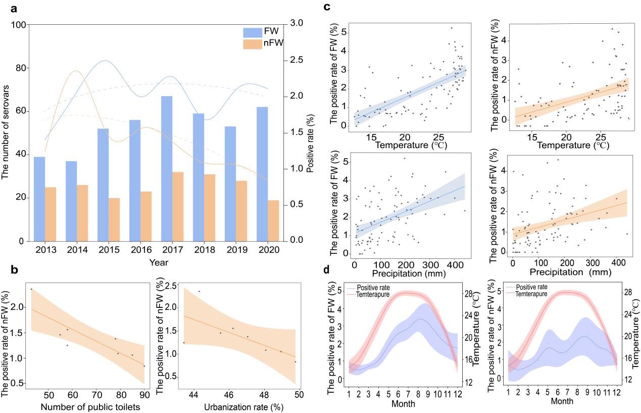 本文以多重耐药菌沙门氏菌为研究对象,对玉林市2013-2020年共采集260,315人次粪便样品并分离沙门菌,结合大数据分析技术,开展药敏检测和全基因组测序分析。课题分为食品从业人员(food workers, FWs)和非食品从业人员(non-food workers, nFWs)两组,对采集自玉林市的食品从业人员体检分离到的沙门菌进行了全面系统的分析。明确无症状感染者中沙门菌的阳性率、血清型分布、耐药性和潜在传播动态。这些发现强调在“同一个健康”框架下,需要加强对健康人携带病原菌和耐药基因组的研究、补足全链条监测短板,需要对食品从业人员开展有针对性的干预措施来保障食品安全。这些研究分析受到了国际评审人的高度认可“I have long found it difficult to believe that there is not carriage of non-Typhi (and Paratyphi) Salmonella among healthy individuals. This study is monumental in scale. There have simply never been data presented on such a scale as this manuscript provides, collected in a longitudinal manner, and related to factors that clearly show an elevated risk of carriage among food workers (FW) relative to others. I believe the scope and scale of this work allows us to state this with greater certainty.”