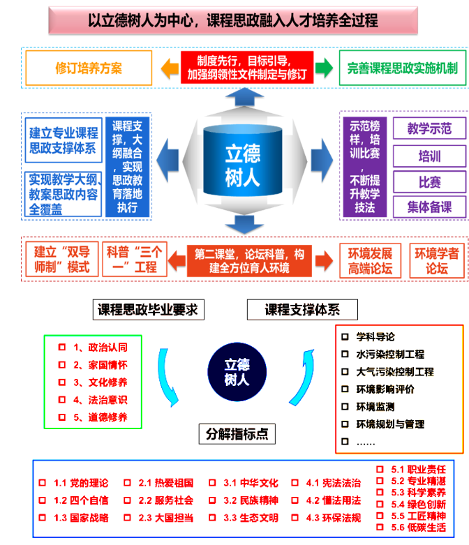 为实现立德树人根本任务,本专业结合教育部指导意见和工程教育专业认证要求,构建了基于“四合”模式的课程思政教学体系,将思政目标与培养目标融合,教学大纲与思政案例汇合,支撑体系与评价机制结合,思政培训与主题比赛联合,将课程思政融入人才培养全过程。基于立德树人目标制定政治认同、家国情怀、文化修养、法治意识和道德修养五个课程思政的毕业要求,并将毕业要求分解为18个内涵指标点,分别由各专业课程进行支撑,明确各门专业课程要达成的目标任务,从而构建面向OBE理念的环境工程专业课程思政育人目标指标点分解及课程支撑体系。