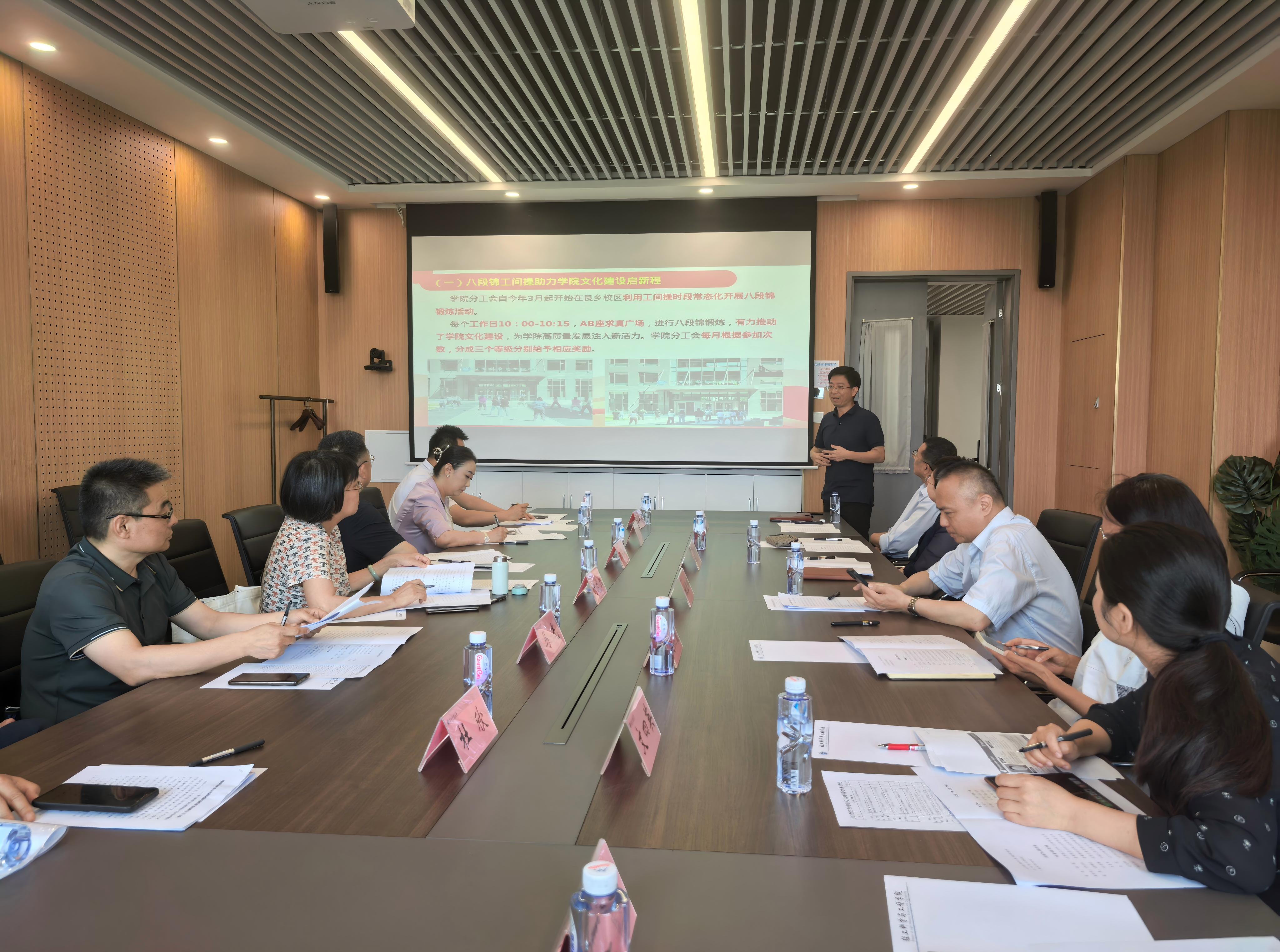 姚志良以《健康脉搏激活发展动能 温暖服务凝聚轻工力量》为题做汇报。学院分工会坚持“党建带工建、工建促发展”的工作思路,紧密围绕学校“建设特色鲜明的高水平研究型大学”战略目标,推动学校“工商一体化”融合发展。通过强化思想引领、深化民主管理、优化服务保障、创新文体活动,充分发挥工会组织的政治性、先进性和群众性优势,将工会工作深度融入学院中心工作,为推动学院高质量发展注入强劲动能。同时,对学院八段锦工间操助力文化建设和共享共享模式共筑温暖小家两项特色工作做重点汇报。