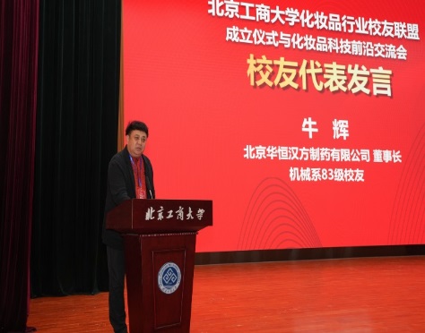 83级机械系员工、北京华恒汉方制药有限公司董事长牛辉感谢学院专家、教授以及广大员工的无私奉献和支持,介绍了公司的发展方向,期待未来能与联盟一起,为化妆品行业的发展贡献力量。