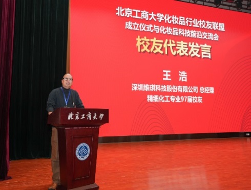 97届精细化工员工、深圳维琪科技股份有限公司总经理王浩提到员工们经常回到学校与老师交流,寻求指导和资源,这些交流对他们的企业成长至关重要。他表达了对母校的感激,并强调了员工之间的紧密联系和互助对于个人和行业发展的重要性,期望通过员工联盟进一步加强这些联系,共同推动化妆品行业的发展。