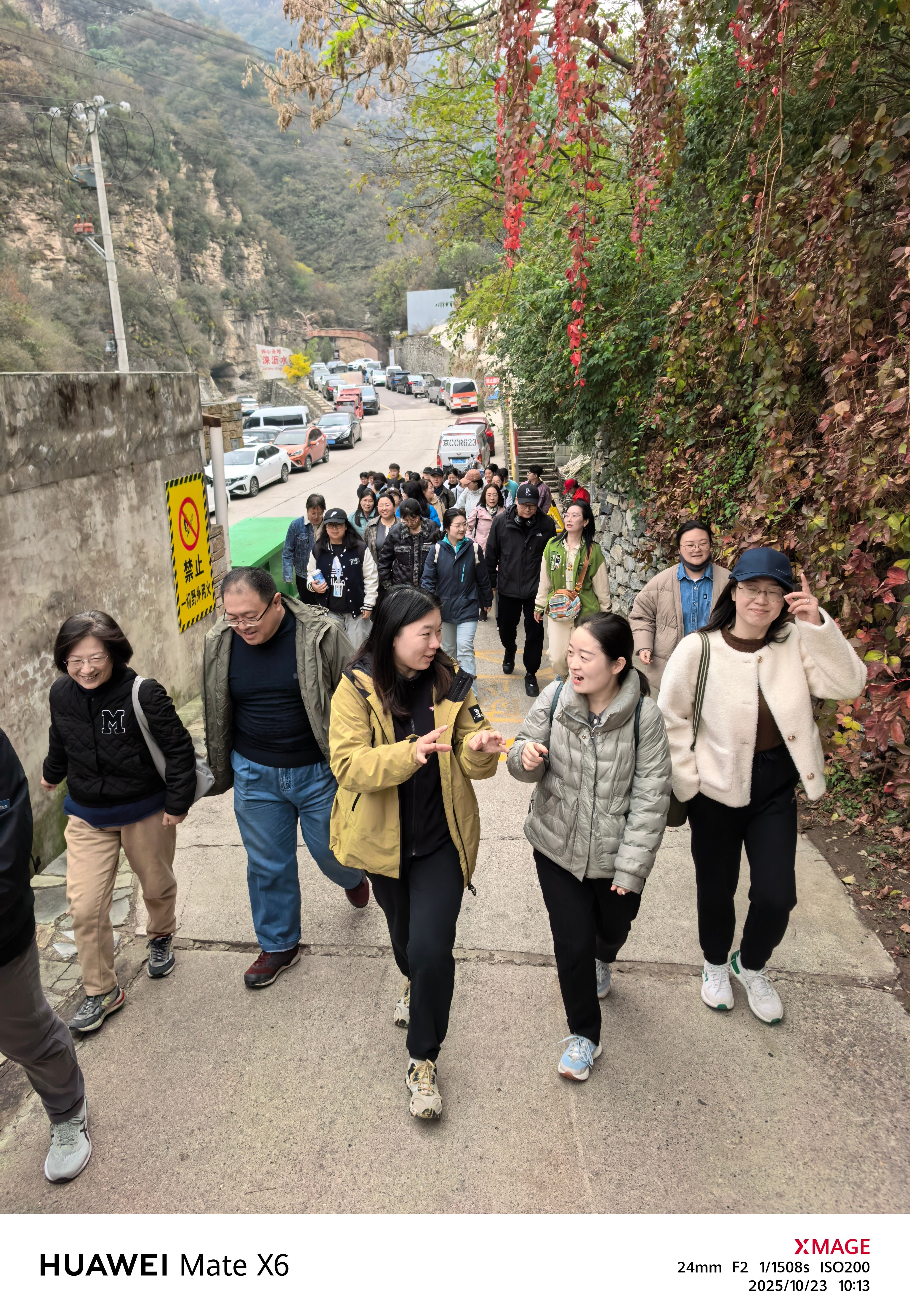 金秋时节的坡峰岭,红叶漫山,层林尽染。教职工们分别从阜成路西区与良乡校区乘车出发,抵达位于房山区幽岚山风景区的坡峰岭。在清新的山风中,大家结伴徒步,沿山道缓步而上,欣赏沿途如火如荼的红叶景观,感受大自然的宁静与壮美。坡峰岭山势平缓,海拔落差约370米,教职工们在徒步过程中不仅锻炼了身体,也放松了心情。